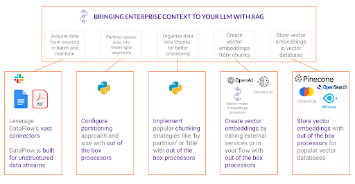 Cloudera Data Flow et les processeurs exclusifs RAG Pipeline de Cloudera simplifient le processus complexe d'affinement des données non structurées par le biais du partitionnement, permettant un découpage plus efficace et des embeddings vectoriels de meilleure qualité. Bien qu'un partitionnement ou un découpage mal conçus puissent nuire aux performances et à la qualité de l'intégration, les outils de Cloudera abstraient une grande partie de cette complexité, rationalisant ainsi le développement de solutions RAG efficaces et fiables.
